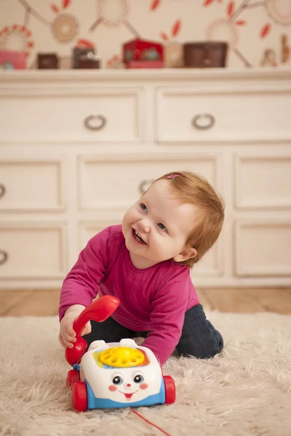 Já a coordenação motora grossa é exercitada ao ficar em pé e empurrar o telefone. Além disso, as cores vivas, movimentos e sons ajudam a estimular os sentidos do bebê.